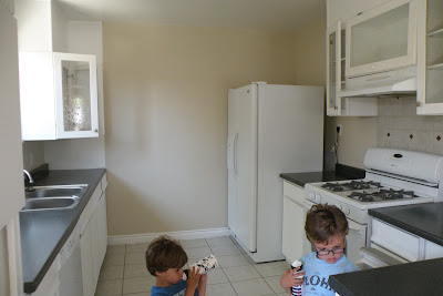 Here it is... empty, but soon to be filled... Our landlord surprised us with this mat, isn't it cute? Front Porch Front yard... boys on their walkie talkie's Our new front porch furniture. The basketball court our palm trees Peyten's new space off of the kitchen The other side Our Room-Master. Yup, those are our closets... Master-this is where our bed will probably go Our bathroom No. 1 In house-Laundry room Austin and Kain's room The other side of their room. (see the built in desk)? It's for his "Kindergarten Homework"